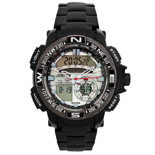 جی فوکس ساعت مچی عقربه ای مردانه بندفلزی طلایی اسپرت دوزمانه دو موتوره ضدآبJOEFOXکرنومتر و آلارم دیجیتال جوفاکسناموجود