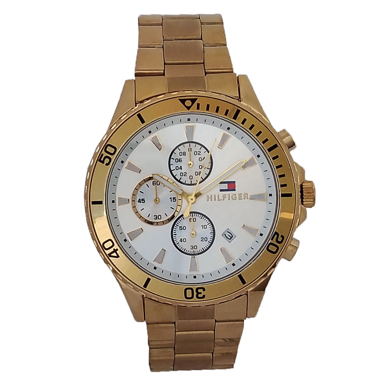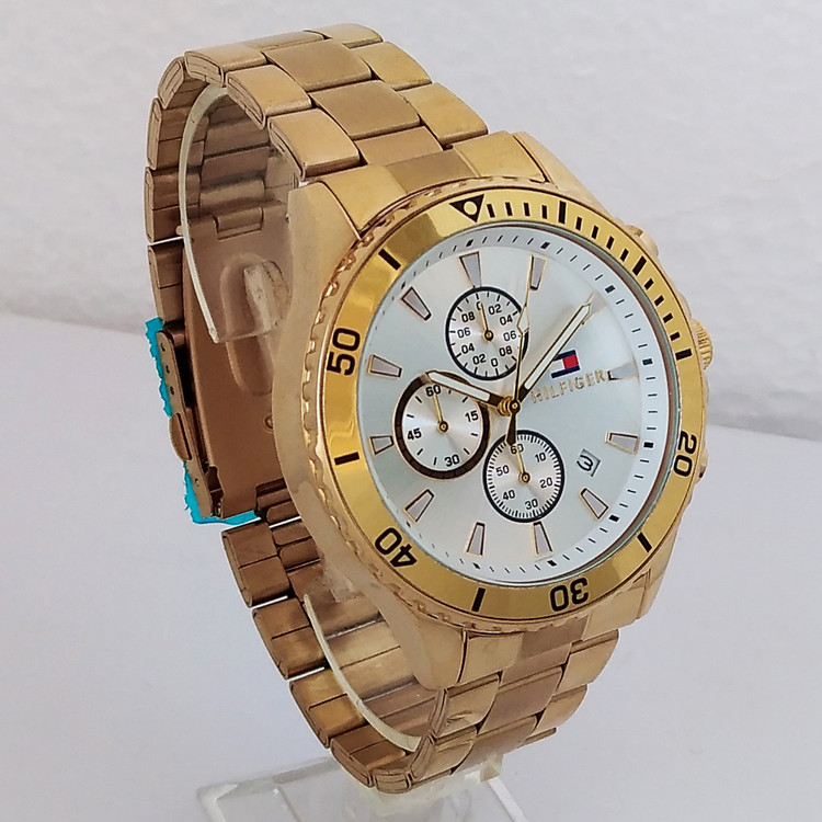 بندفلزی مردانه ضدآب طلایی 3 موتور فعال کرنوگراف .رنگ ثابت فروش ویژه تاریخ شمار اسپرت و شیک