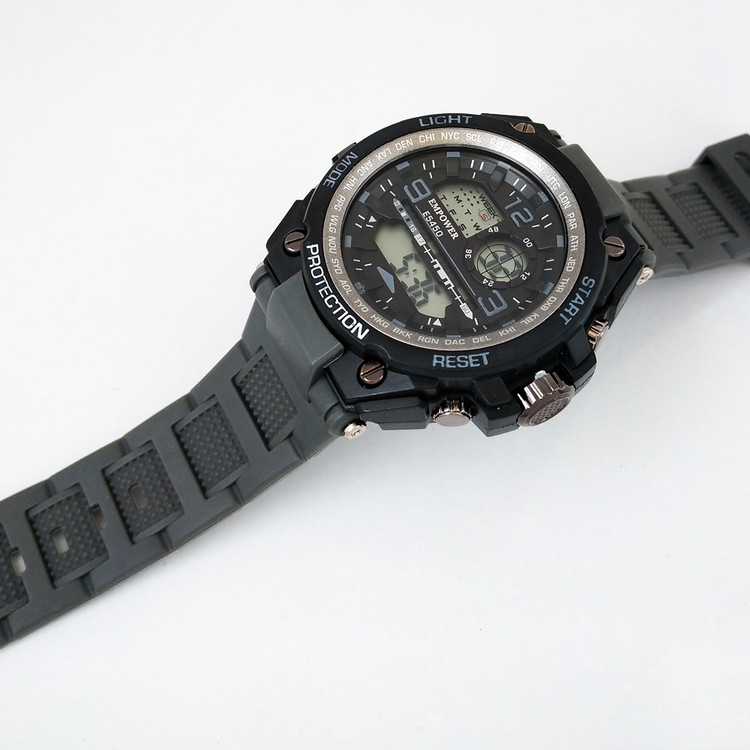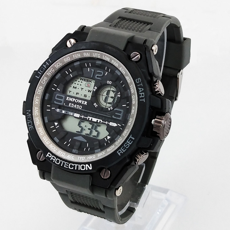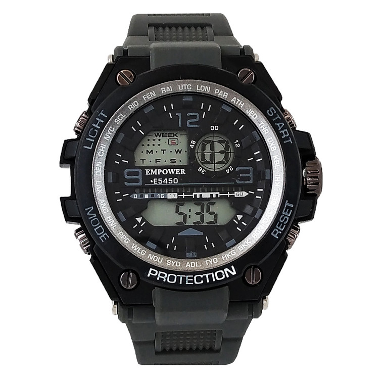 ساعت مچی دیجیتال مردانه امپاور مشکی با بندطوسی EMPOWER مقاوم در برابرآب چراغدار کرنومتردار اسپرت ورزشیSPORT خاکستری بندرابر