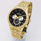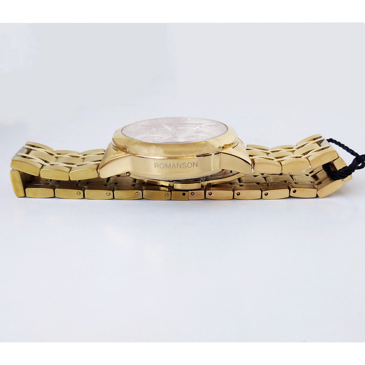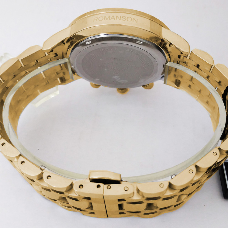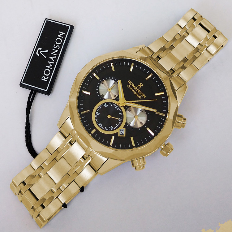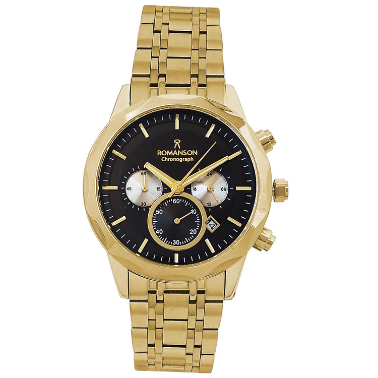 ساعت بندفلزی مردانه عقربه ای ، طلایی مشکی ،کرنوگراف،تاریخ دار،ضدآب،رنگ ثابت،سه موتور،رومانسون،ROMANSON