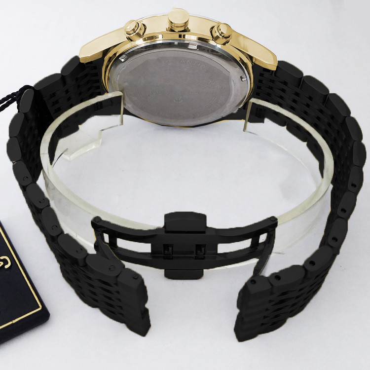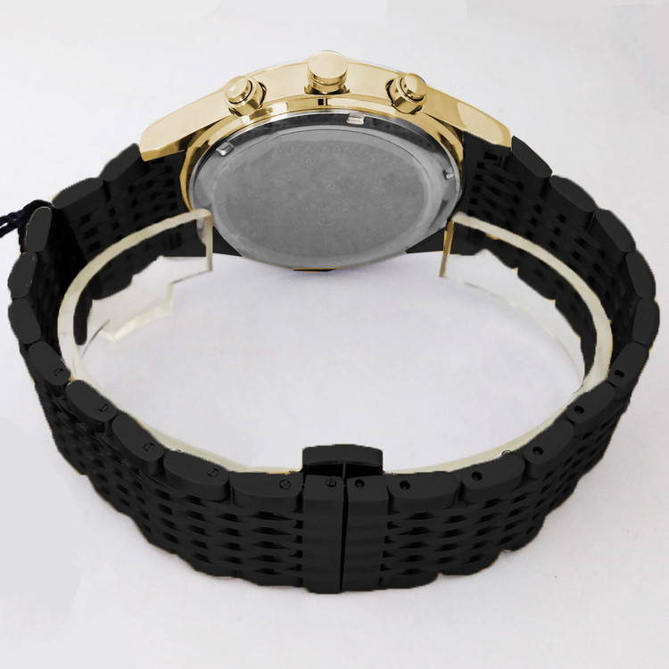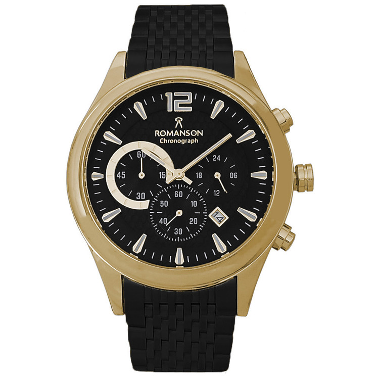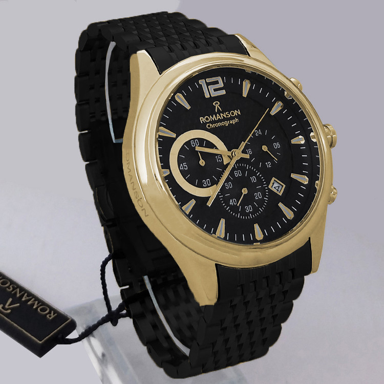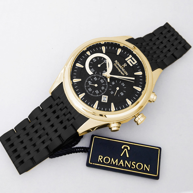 ساعت رومانسون مردانه بندفلزی قاب طلایی بند مشکی ضدآب رنگ ثابتROMANSONسه موتور کرنوگراف کادوتولد