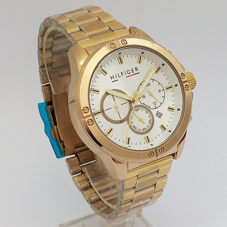 ساعت عقربه ای مردانه طلایی از برند هلیفیگر، یک انتخاب شیک و مدرن برای آقایان است. این ساعت با بدنه طلایی و بند استیل، ظاهری لوکس و جذاب دارد که مناسب برای استفاده روزمره یا حتی رویدادهای رسمی است.