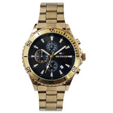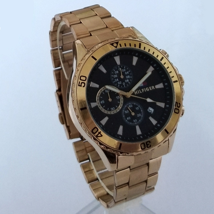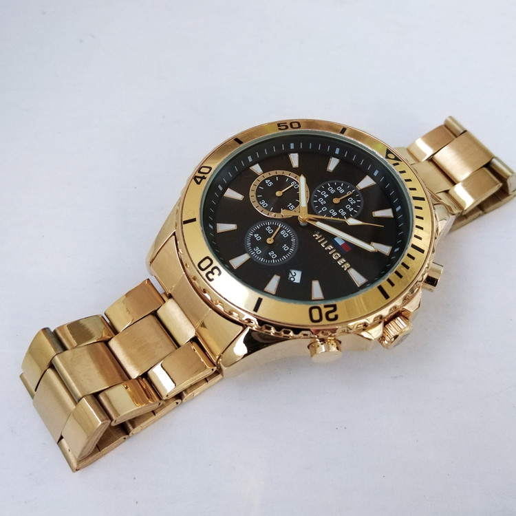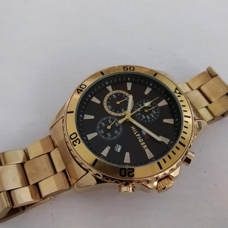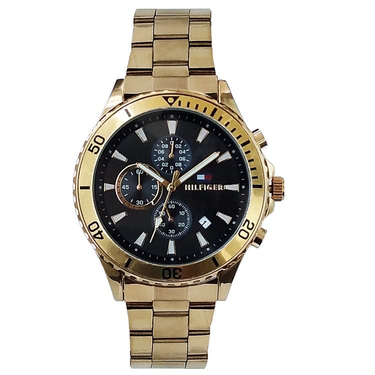 بندفلزی مردانه ضدآب طلایی سه موتور فعال کرنوگراف رنگ ثابت فروش ویژه تاریخ شمار اسپرت و شیک هلیفیگر