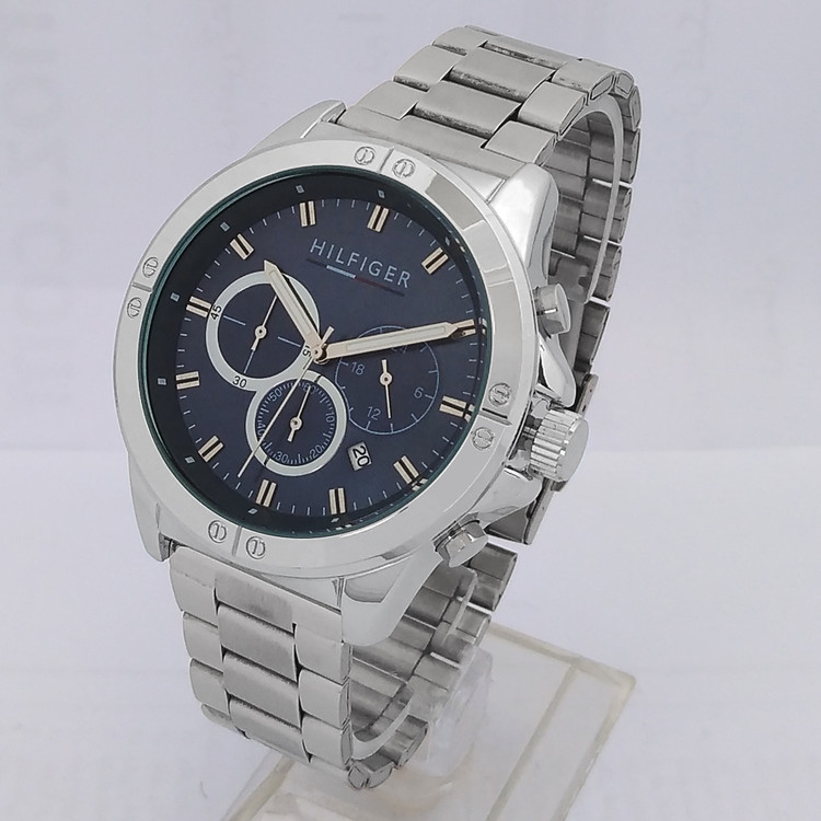 بندفلزی مردانه ضدآب نقره ای سورمه ای 3 سه موتور فعال کرنوگراف رنگ ثابت فروش ویژه تاریخ شمار اسپرت و شیک هلیفیگر سرمه ای