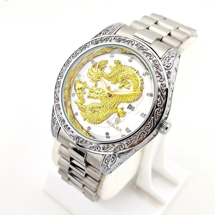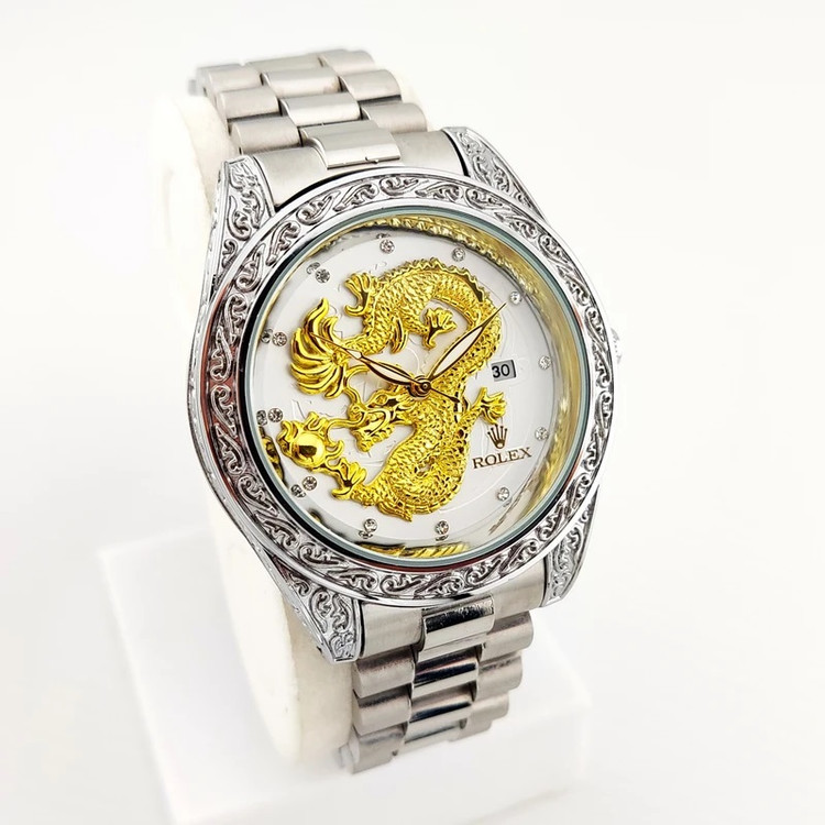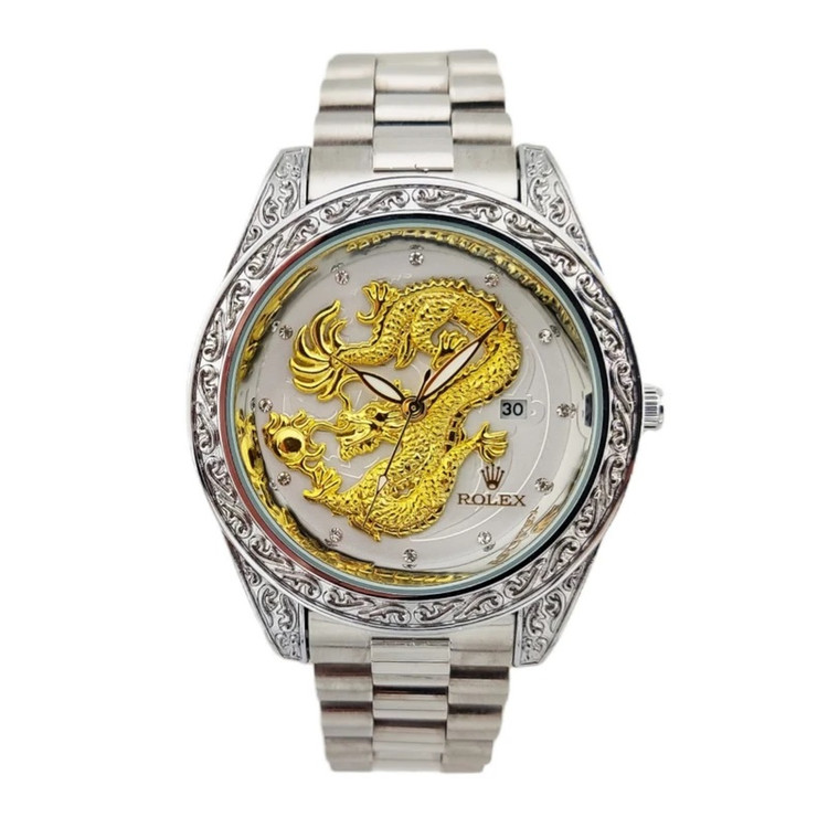 ساعت مردانه بندفلزی رولکس ROLEXدراگون برجسته قاب حکاکی با ارسال رایگان دراگون نقره ای طلایی اژدها