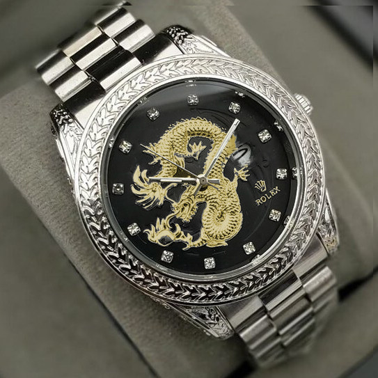 ساعت دراگون برجسته قاب حکاکی مردانه بندفلزی رولکس ارسال رایگان دراگون نقره ای مشکی طلایی ROLEX