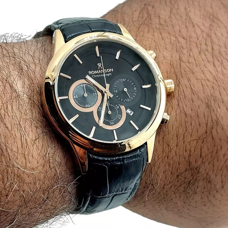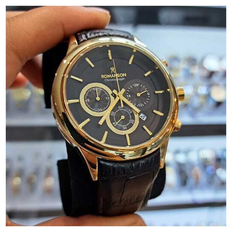 ROMANSONسه موتور رومانسون ساعت مردانه بندچرمی مشکی طلایی کرنوگراف تاریخ دار ضدآب ارسال رایگان