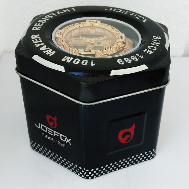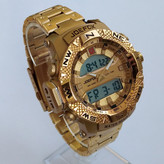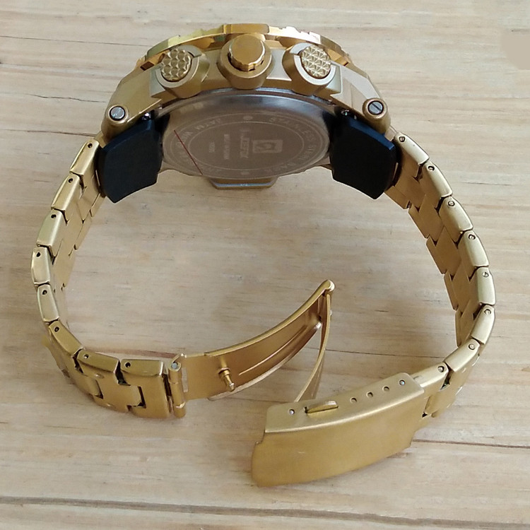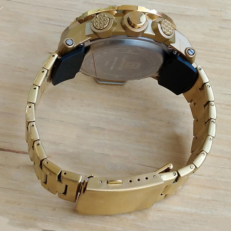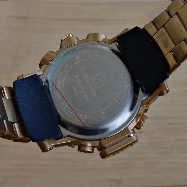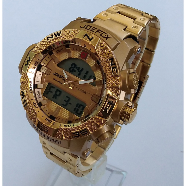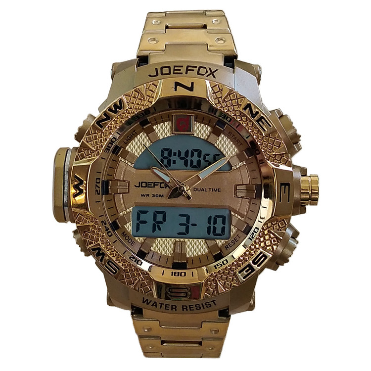 جی فوکس ساعت مچی عقربه ای مردانه بندفلزی طلایی اسپرت دوزمانه دو موتوره ضدآبJOEFOXکرنومتر و آلارم دیجیتال جوفاکس