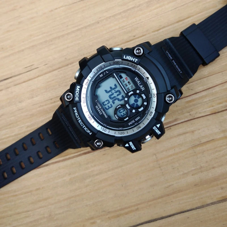 ساعت مچی دیجیتال مردانه و پسرانه WALARمشکی نقره ای مقاوم در برابر آب چراغدار کرنومتردار اسپرت ورزشیSPORT والار