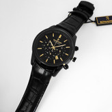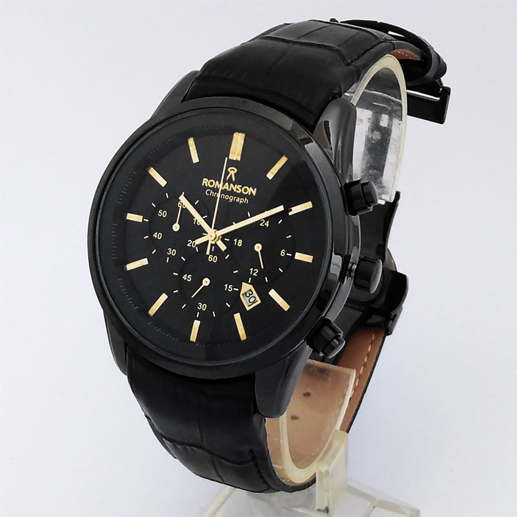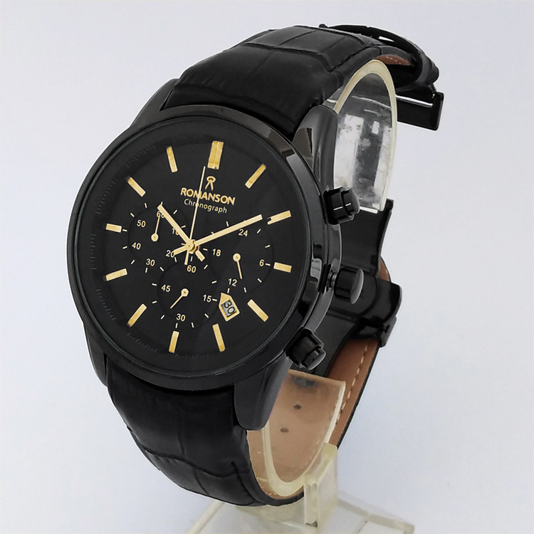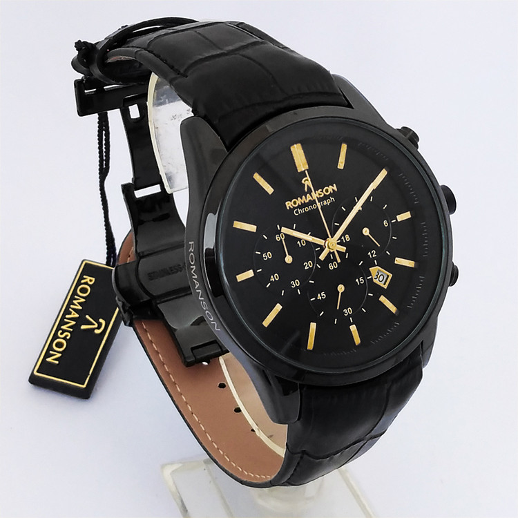 ساعت مردانه مشکی طلاییROMANSONسه موتور رومانسون کرنوگراف تاریخ دار ضدآب بندچرمی ارسال رایگان