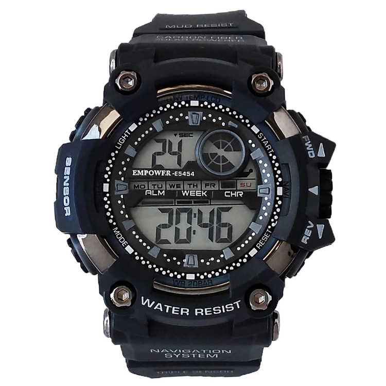 ساعت مردانه اسپرت SPORTپسرانه ضدآب دیجیتال امپاور مشکی نقره ای طوسی EMPOWERکرنومتردار چراغدار تایمر باکیفیت دوسوراخ
