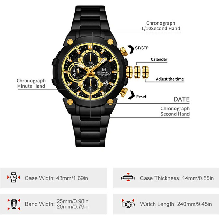 این ساعت عقربهای مردانه دارای ظاهری شیک و جذاب بوده و برای استفاده در هر شرایطی کاملا مناسب خواهد بود.برند نیوی فورس بر روی صفحه،سرکوک،قفل و پشت درب ساعت به زیبایی حک شده است.دارای کارت،دفترچه راهنما و جعبه با برند نیوی فورس می باشد.