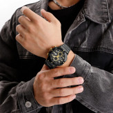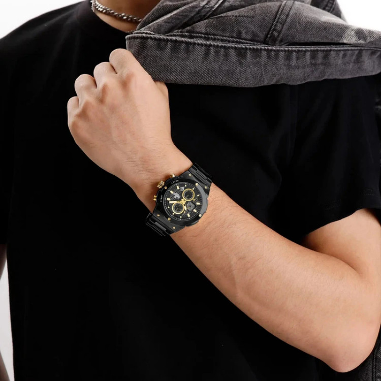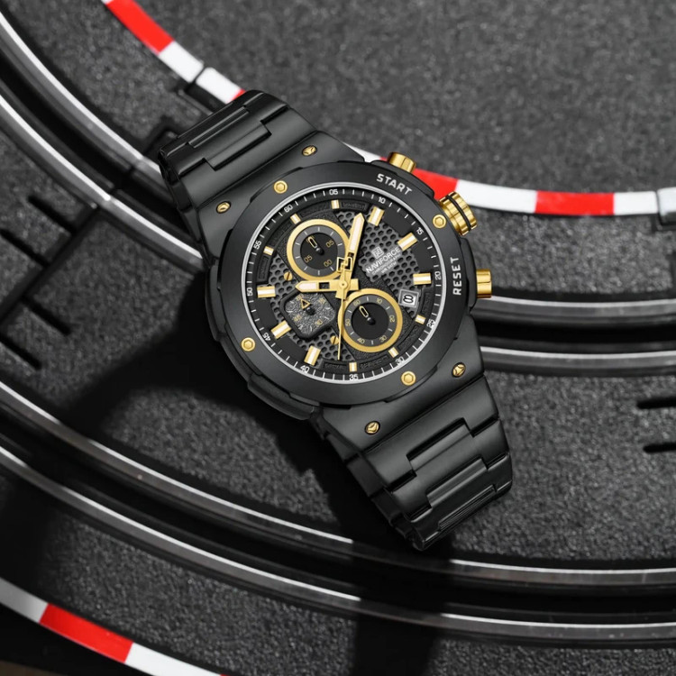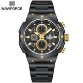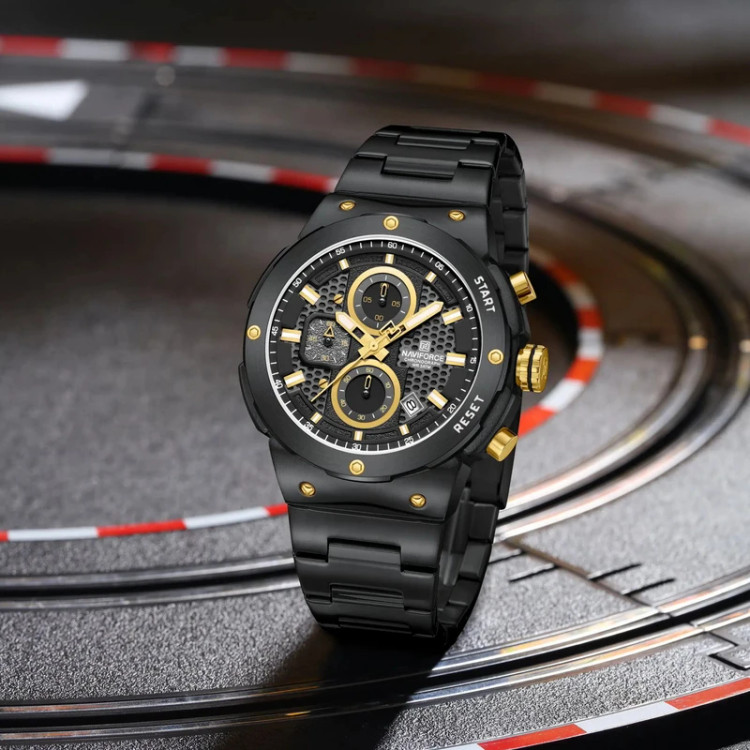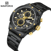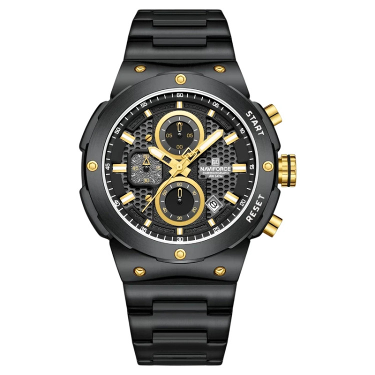 ساعت مچی عقربهای بندفلزی مردانه نیوی فورسNAVIFORCE مدل سه موتوره کد NF8072BB سه موتور فعال ناوی فورس مشکی طلایی