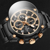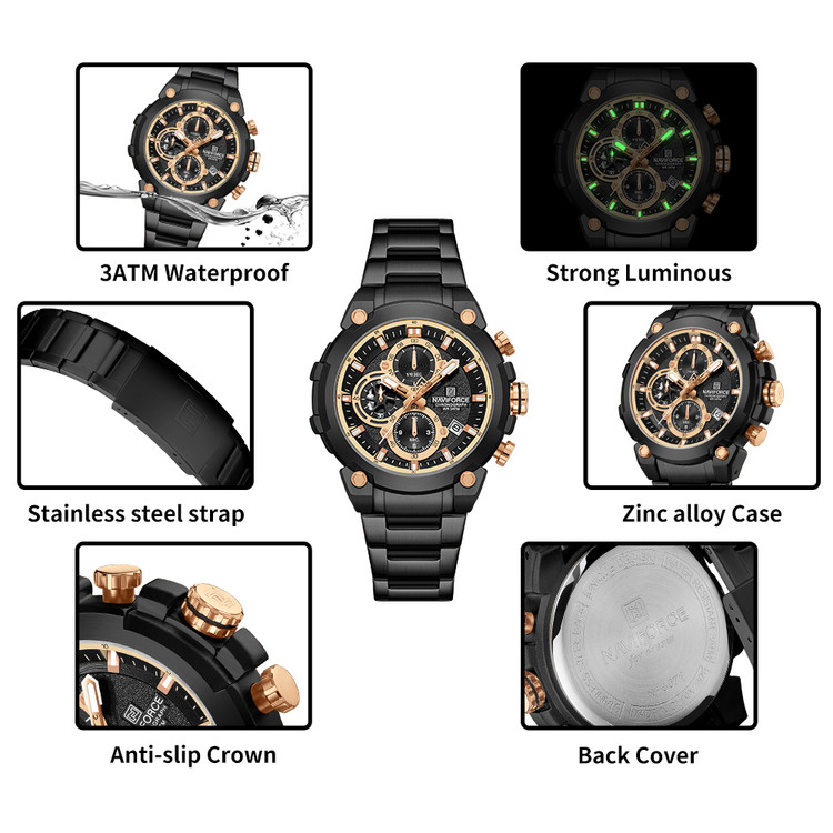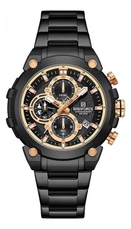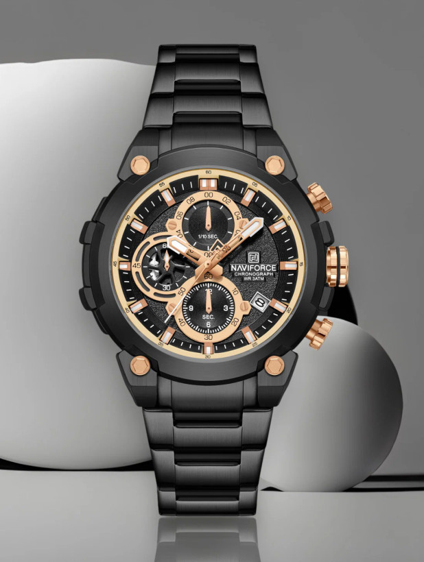 ساعت مچی عقربهای بندفلزی مردانه نیوی فورسNAVIFORCE مدل سه موتوره کد NF8072BB سه موتور فعال ناوی فورس مشکی رزگلد