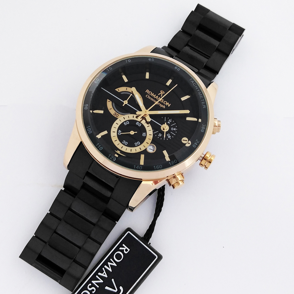 رومانسون ساعت مردانه مشکی طلایی مردانه سه موتور کرنوگراف تاریخ دار ضدآب بندفلزیROMANSON ارسال رایگان کادو کپی