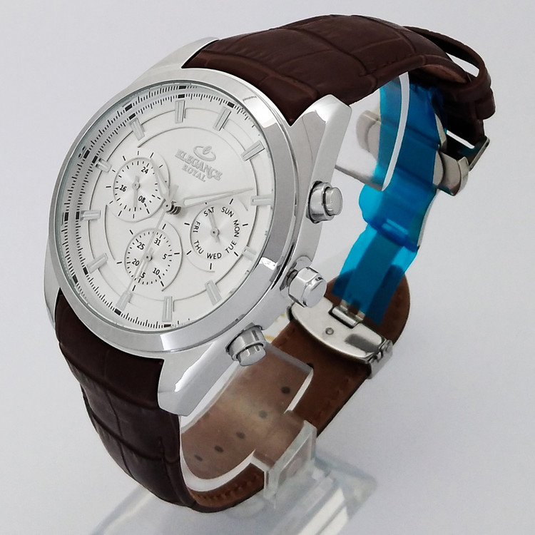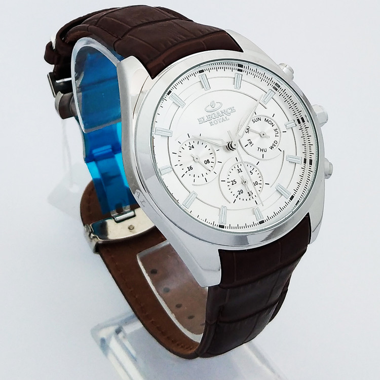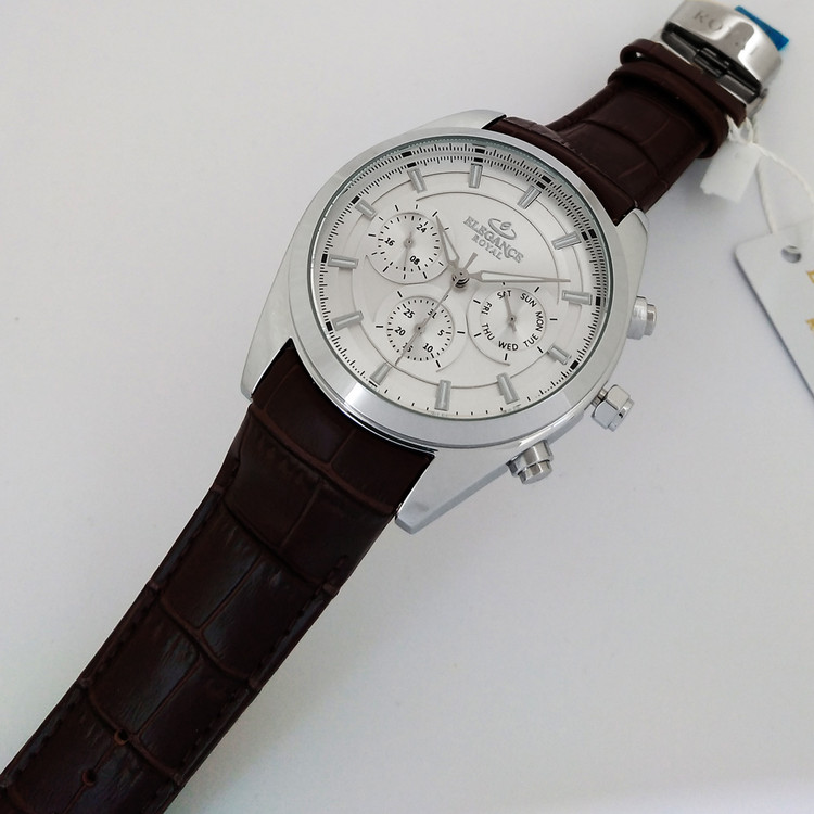 ساعت بندچرمی کرنوگراف الگانس سه موتوره مچی مردانه اسپرت نقره ای SPORT قهوه ایELEGANCE ضدآب سه موتور فعال فول تایم رویال بندچرمی